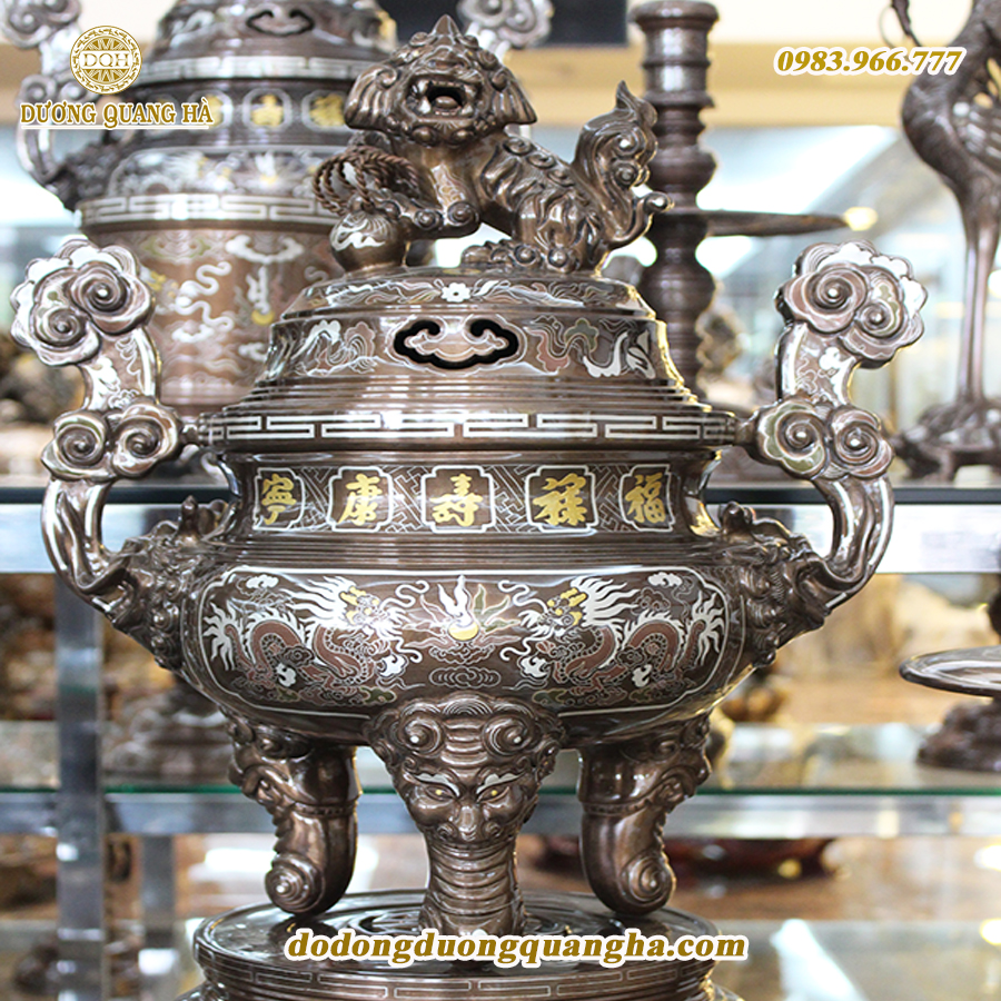 1. Chất liệu: Đồng đỏ, đúc thủ công, khảm ngũ sắc ( vang9999, bạc, đồng đỏ, đồng vàng, đồng xanh )