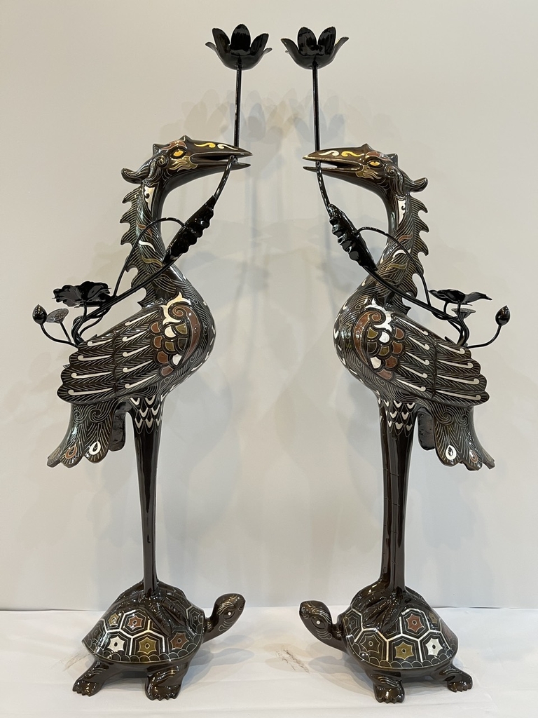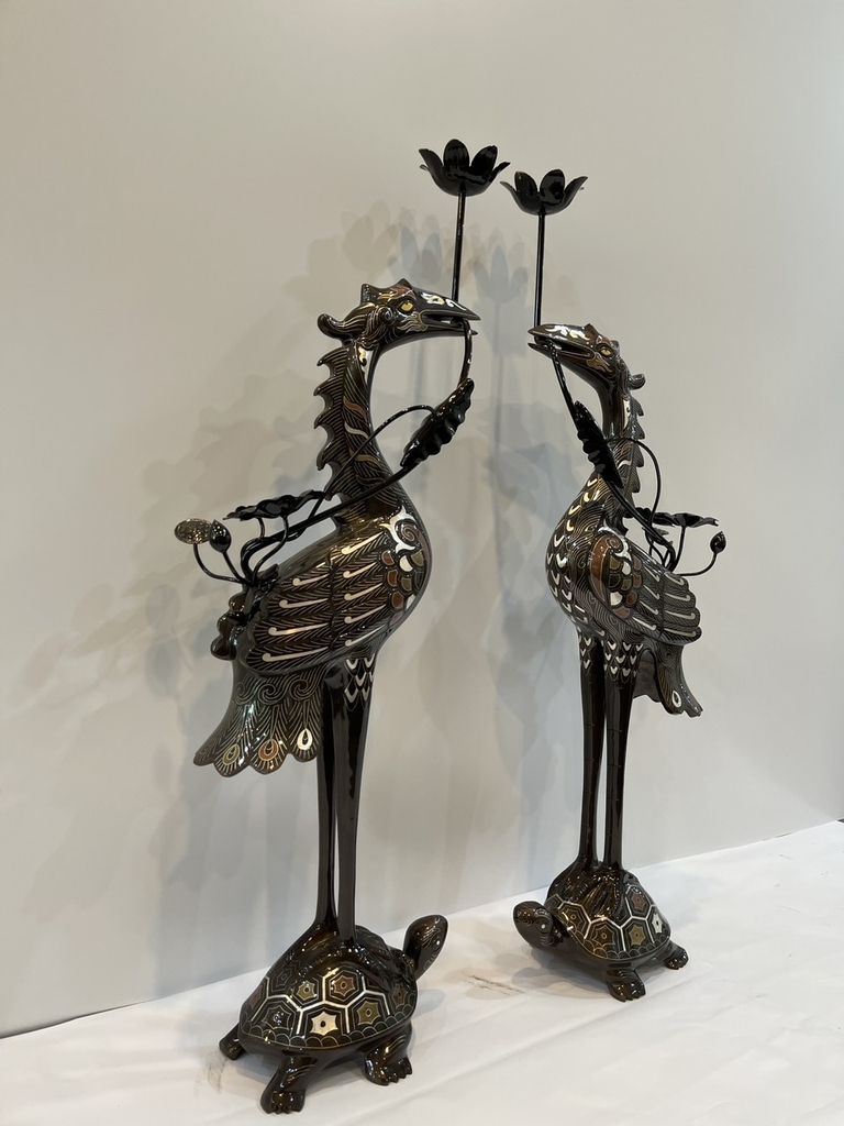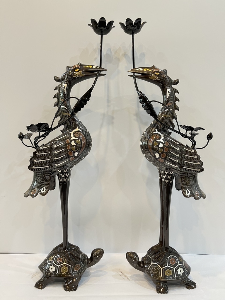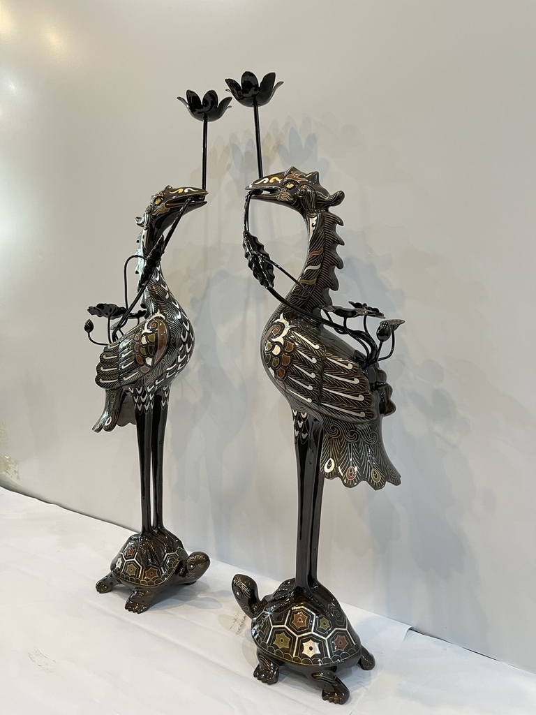 Tên gọi sản phẩm: ĐÔI HẠC THỜ ĐỒNG ĐỎ KHẢM NGŨ SẮC CAO 75CM